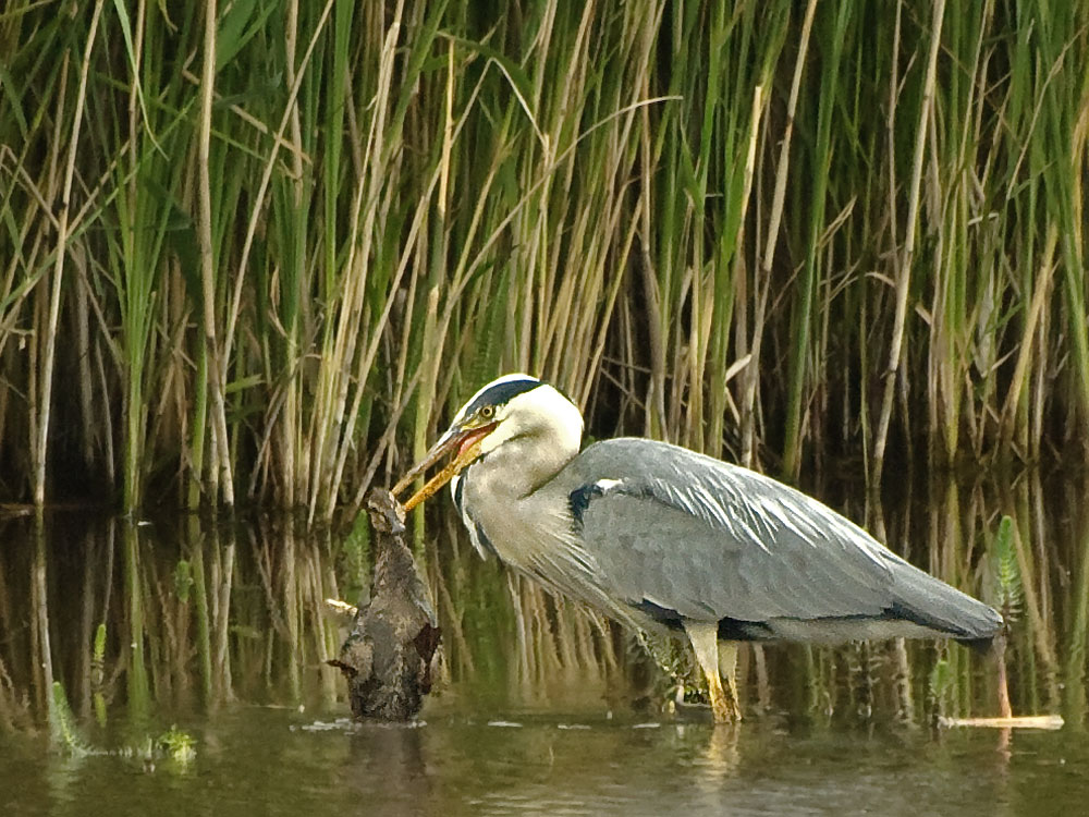Beskrivelse: Hejren stod fuldstændig stille, 2 ællinger kom langsomt forbi, haps sagde det, så var den ene fanget i hejrensnæb.