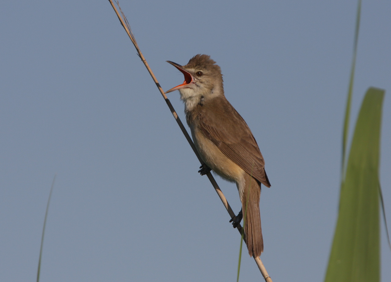 Beskrivelse: Clamorous Reed Warbler ssp brunnescens is sometimes referred to as Indian Reed Warbler Acrocephalus brunnenscens, e.g. Rasmussen, P.C. & Anderton, J.C. Birds of South Asia. The Ripley Guide. Vols. 1 and 2. Smithsonian Institution and Lynx Edicions, Washington, D.C. and Barcelona. BUT usually treated as conspecific with Clamorous Reed Warbler A. stentoreus. Field characters in fresh or slightly worn plumage which separates it from Great Reed Warbler Acrocephalus arundinaceus: Finer, decurved-looking bill than nominate G.R.W. with dark distal lower mandible - G.R.W. has more heavy and thicker bill. In fresh plumage pale throat contrasting unstreaked darker breast. In addition C.R.Ws darker brownish-olive breast. belly and flanks easily separate it from G.R.W. I noticed at several specimens of C.R.W. the white supercilium between bill and eye appears short and fat, whereas it is more obvious prolonged at G.R.W. However it depends on light, the birds posture and wind… Most individuals supercilium at C.R.W. extend above and behind the eye – in the fields guides its mentioned as smaller than G.R.Ws. Slightly lesser size compared to G.R.W. not obvious but can be sensed in jizz in the field. Shorter wing projection than G. R.-W. Habits of C.R.W.: Skulking, often keep down close to water. Clumsy and noisy moving around in the reeds. Not particularly shy when moving through the reed beds, but tends to dislike the experience being looked at through binoculars or camera lens… In other words a quite aware bird. Regularely singing from trees if present, but usually singing from the reeds while slowly climbing upwards during the song. Often return to same song-post; it tends to have 2-3 favorite song-posts in its rather small territory. Often involved in intraspecific territory strides – where the birds very noisy and clumsy chase each other among the reeds or down close to ground. C.R.Ws voice is worth a study. Its harsh guttural low-pitched noisy irregularly spaced notes make it a clear candidate for the worst singing among the world’s Acrocephalus. The book “Birds of South Asia” makes a colorful brave description of its song notes (try to repeat yourself; quite an impossible task): “Krsh-krsh-krsh… vurch/IK vurch/IK, gurdy-gurdy, krr-kru-vit…tzwink-tzwink-tzwink; scratch/it-scratch/it… gaarsh, garsh… kleeeuw… kutz-kut-zweet... “ I think it’s easier to describe its song as a lousy singing G.R.W. A typical big-Acrocepahlaius that sings uttermost horrible and incomplete (often stops abrupt after few seconds… hesitate for some seconds and begins from the start again). It’s not at all difficult to deal with the song of C.R.W. As it’s quite unmistakable. It never sings like G.R.W. with its hoarse repeated “Kara-kara-kit-kit” song. C.R.W. is the most common Acrocephalus in northern Kyrgyzstan.C.R.W. occurs wherever reed beds are present, even in smaller ponds. Other species of Acrocephalus is uncommon; I don’t know why… On migration Blyth’s Reed Warbler is abundant but rarely other Acrocephalus are to be seen or heard. Arend Wassink, the author of “The Birds of Kazakhstan” writes C.R.W. recently, spreading north- and eastwards, partly overlapping with G.R.W. and the two species hybridize at Kamennoe Lake in Kazakhstan.
