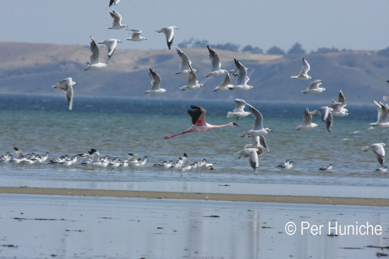 Det må være en Lille Flamingo. Fuglen virker ikke så grotesk langhalset og langbenet som en Stor Flamingo, og desuden er den mere ensartet jordbæris-farvet med mørkt næb, hvor Stor Flamingo er hvidere med mere spredte lyserøde partier samt tofarvet næb med lyst indernæb og mørkt ydernæb.