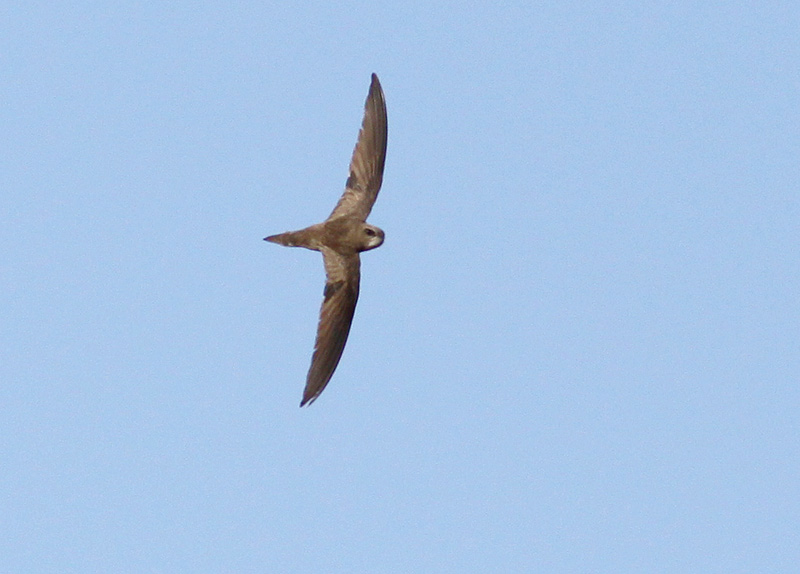 This Pallid Swift shows typical PS characters such as greyish-brown overall impression, paler trailing edge to innerwing (contrasting well to darker mantle) and dark eye-mask surrounded by pale. However, the very dark inner primaries confused! According to HBW, Pallid Swift often moult inner primaries at time before leaving breeding sites, whereas this is rare in Common Swift. Surely, the inner primaries and their coverts are very fresh, but i was surprised to find such dark inner pp.