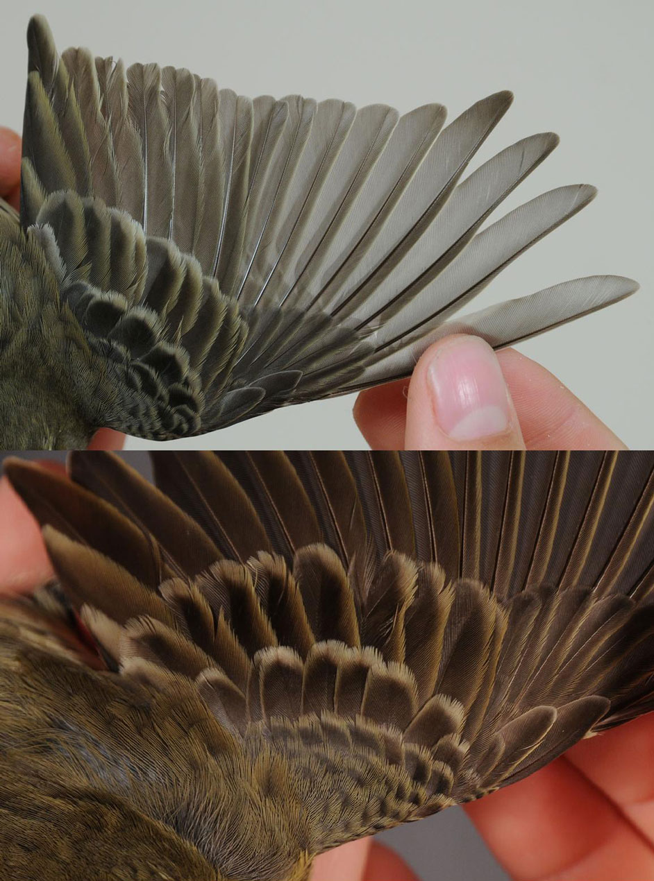 De to individer herover viser meget godt denne forskel. Fuglen överst har fäldet alle små og mellemste däkfjer, de tre tertiärer og alle store däkfjer - bortset fra den inderste og femte inderste. Fuglen nederst har derimod kun fäldet de små däkfjer (foruden en enkelt fjer).
