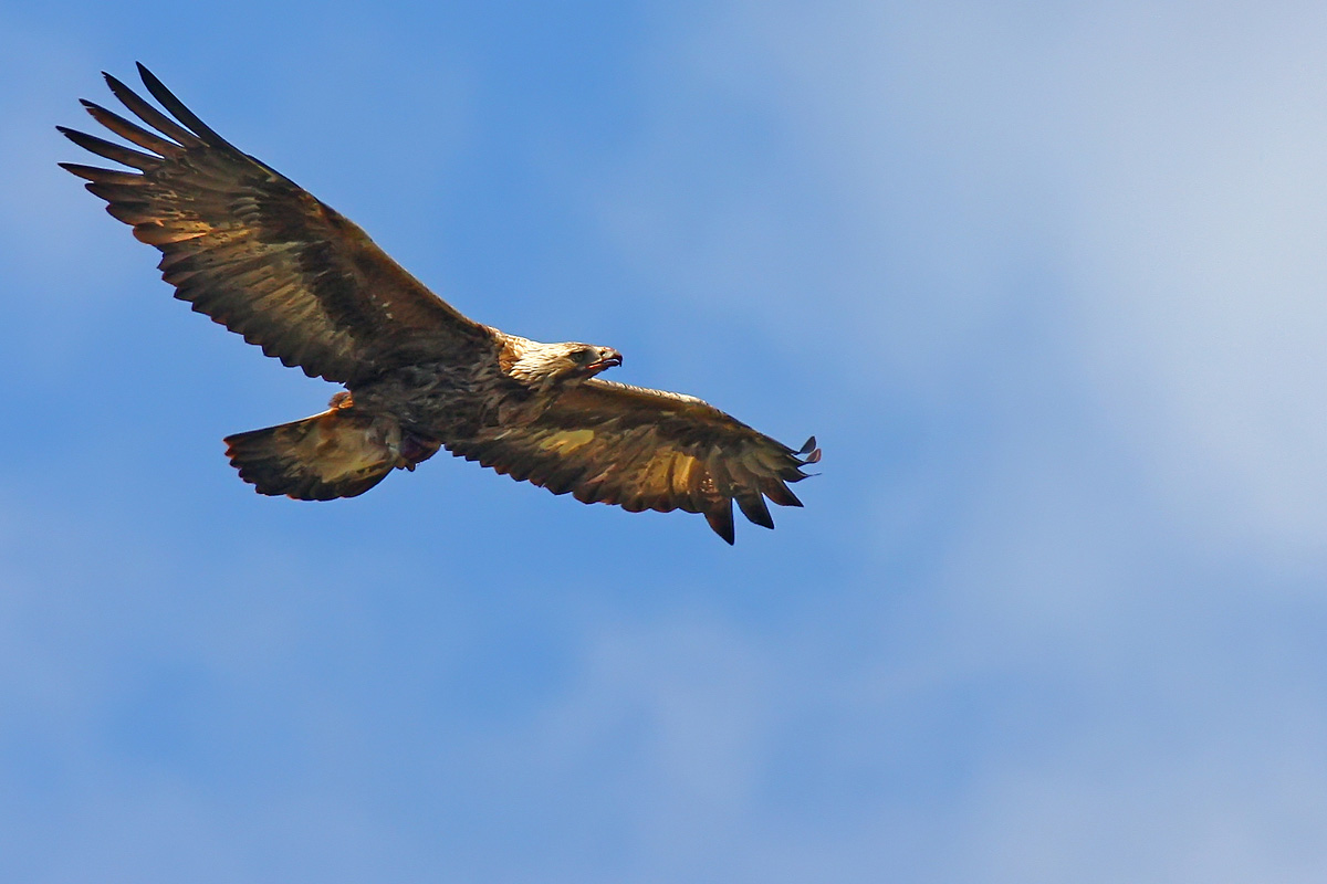 Denne (sandsynligvis) meget gamle fugl har fået så lys iris som kongeørne kan få, og er desuden så solbleget og med så mange slidte fjer (her før den årlige- men hos adulte ørne ikke komplette- fældning),at helhedsindtrykket af undersiden nærmest leder tankerne hen på en yngre Kejserørn.