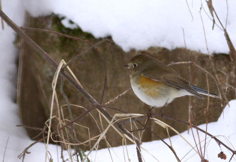 Beskrivelse: Den skånske Blåstjert, der er en 2K (spidse halefjer, små lyse pletter på store dækfjers spidser). 2K - der i princippet er hunfarvet - kan undertiden kønsbestemmes (jeg har her støttet mig til de grundige beskrivelser i HBW). Denne fugl har jeg bedømt som han på baggrund af en kombination af: 1: Blåtoning på alula og små dækfjer. Hunner angives her at være brune. 2: Ret dybt blå hale (i felten reelt "hanagtig", hun hunner generelt lysere. 3: Meget varmt orange forflanker (bør være lysere hos hun). I felten var forflankerne påfaldende gulorange, næsten som hos Amerikansk Ildstjert, og f.eks. meget kraftigere end jeg har set hos hunner vinter/forår. Bemærk i øvrigt det frække lille opstoppernæb, og den brede hvide øjenring. Sort næb og lys strube giver i øvrigt tit associationer til Taigafluesnapper.
