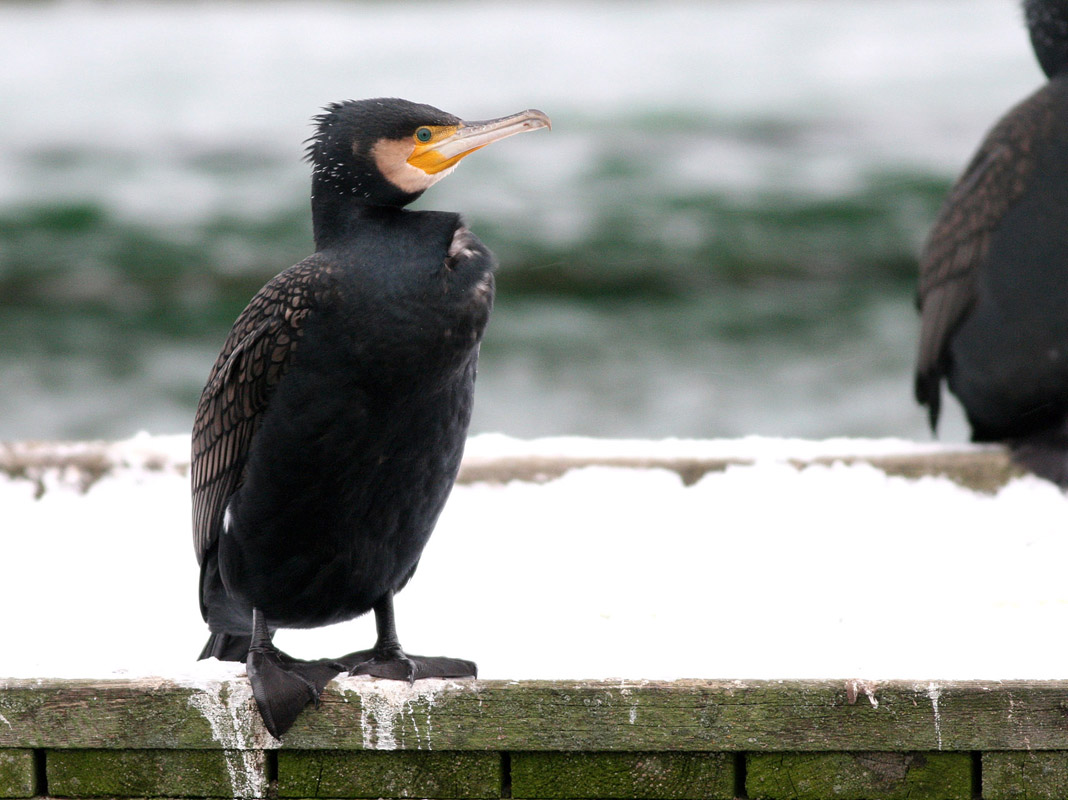 Beskrivelse: Søgte også i dag bevidst efter Storskarv, da mulighederne netop i denne isvinter er ideelle i Klintholm Havn. Skarverne sidder ugenert på mellem 10 og 30 m afstand og er nemme at bedømme i teleskop eller håndkikkert. Den såkaldte "gule vinkel" mellem gabet og den gule huds bagkant nedadrettet er afgørende for at adskille carbo og sinensis (se Birding World Vol.18 nb.3 samt Strømstæren Nr.3 Dec. 2007). Vinklen for Storskarv skal være mindre end eller = 65 grader, og for Mellemskarv større end eller = 73 grader. Denne fugl er målt på fotoet til 50 grader, altså = carbo. 1-3 % af skarverne i Klintholm Havn er i øjeblikket ssp. carbo. Langt de fleste har en vinkel der er tæt på 90 grader (sinensis), nogle (få ?) ligger i overlapningszonen og kan ikke feltbestemmes