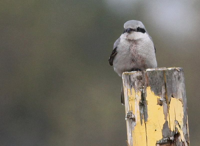 Beskrivelse: Denne Store Tornskade så lidt mystisk ud på afstand, da den rent oversidemæssigt ikke var i den lyse ende, og så så den lyserød ud på undersiden på afstand - en kombi, der signalerer Sydlig (nu Iberisk) Stor Tornskade. Nærmere check afslørede dog, ar undersidens mørkere farve skyldtes en kombination af tætte, men smalle mørke tværbånd (sands. tegn på 1K) og en forstyrrende rosarød "saft", der her ses midt på brystet, og som nok stammer fra, at tornskaden umiddelbart før den blev fotograferet har guffet et blødende bytte i sig! Eftersom Stor Tornskade tager smådyr og fugle kan blod-forurening altså let opstå og give en falsk farvet lyserød underside.