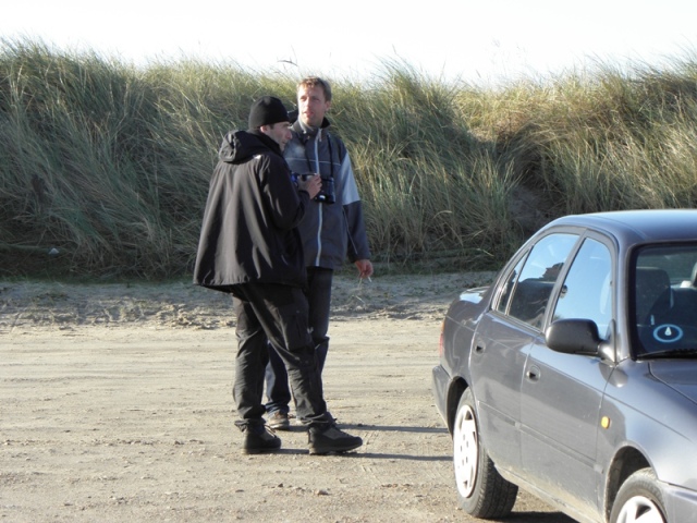 Beskrivelse: Finderen af træffets sjældneste fugl 2008, Torbjørn Eriksen, veksler et par ord med arvtageren, Tim Hesselballe, efter at denne har fundet Sibirisk (/Amerikansk) Fløjlsand ved Ishuset.