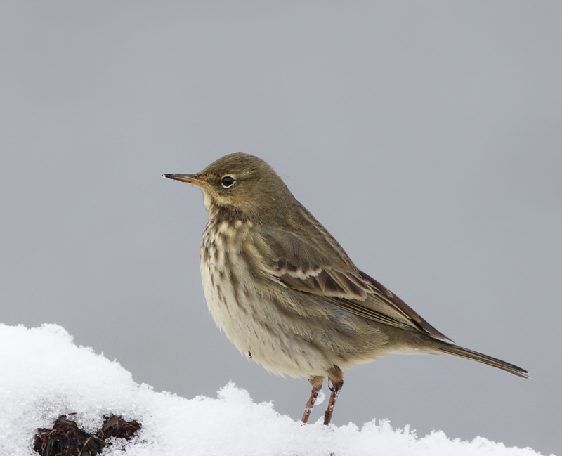 Enig med Jens.......Blev nødt til at formulere det sådan :-)...i at det er en Skærpiber, Anthus petrosus, baseret på, som Jens også nævner, diffuse striber på flankerne og olivengrønlige indtryk man får af fuglen, selv i det hvide skær fra sneen. Men jeg mener også at flanken bliver mørkere bagtil, hvor jeg ville have forventet at Bjergpiberens, Anthus spinoletta, havde holdt samme farvetone hele vejen, specielt i dette kraftige lys.