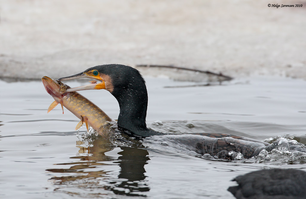 Nu må der da snart være grænser for, hvad du fodrer de dyr med i Nordsjælland, det ender jo med, at de overlever vinteren. Du startede vel med mus, så blev det lille lappedykker og småfisk, og nu så en gedde.