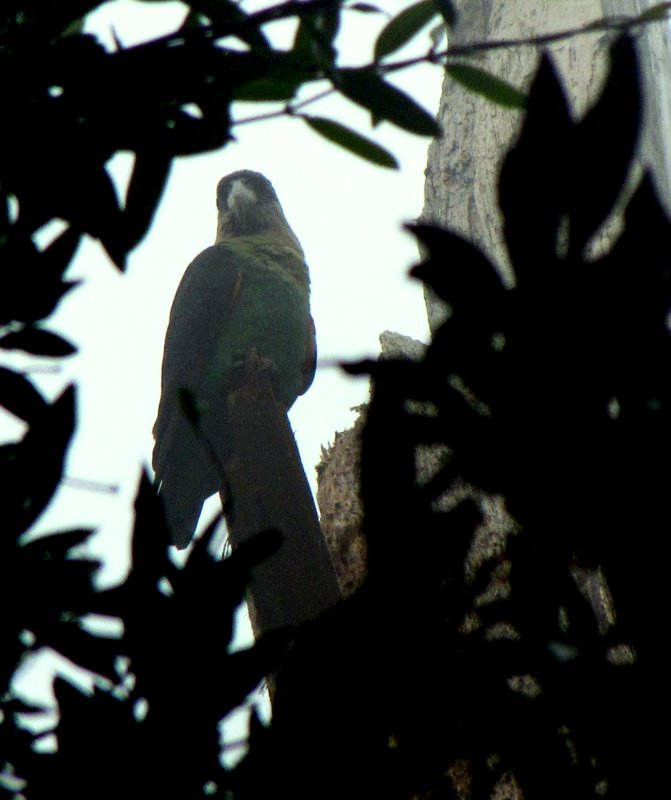 Beskrivelse: Et stemningsbillede fra en tåget morgen i selskab med den stærkt truede Cape Parrot, hvor bestanden formodentlig er under 1000 fugle.