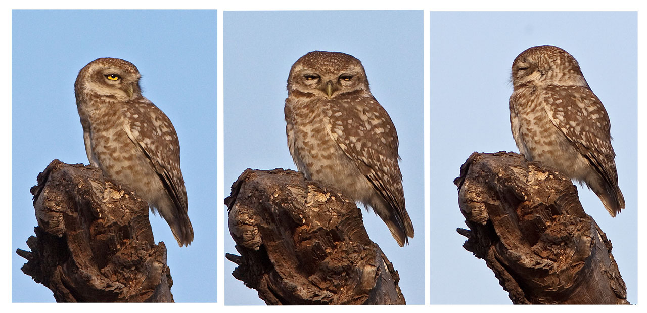 Beskrivelse: Til sammenligning med regnvejrscollagen af indisk kirkeugle er her en collage af indisk kirkeugle taget i solskin