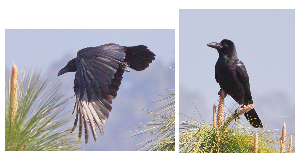 Tilføjet med mindre skrift: Also known as Large-billed or Jungle Crow C. macrorhynchos, and considered conspecific with C. levaillantii and C. japonensis