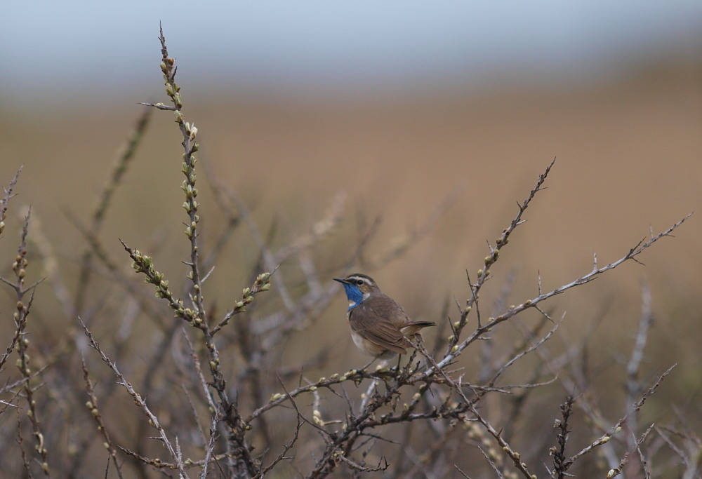 Beskrivelse: Dette kan ifølge pålidelige kilder udgøre Skagens første fund af sydlig blåhals. På billederne ses dog en svagt mørkere kant øverst i det hvide felt på halsen. Kan det pege på en afvigende nordlig blåhals eller findes denne variation indenfor sydlig?