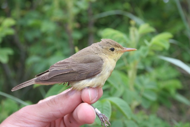 I hånden en noget nemmere sag, hvis du er vant til at ringmærke, kunne du allerede mærke hvor lille den føltes i forhold til de mere kraftige Gulbuge. Alene vingelænge var markant kortere,Blåvand-fuglen havde en vingelængde på 65.5 og når maks 71, hos Gulbug starter målene fra 73. Hos Spottesanger er 2nd p mellem 6/7 mens den hos Gulbug er 2nd mellem 4/5. Personligt synes jeg dens ben er mere slanke og de er desuden brunlige og ikke blålige som hos Gulbug.