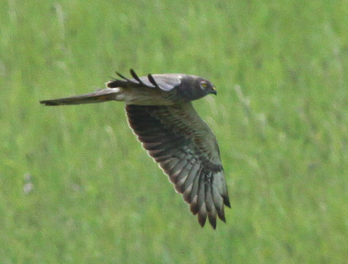 Beskrivelse: Bør være Hedehøg pga. markante sorte vingespidser og mørk bagkant på hånden. Desuden stort set manglende lys halskrave på dette fældningsstadie, hvor gråtonede fjer er indblandet i brune på hoved, hals og forbryst (2k han), og Gult øje svarer til han på dette tidlige alderstrin.