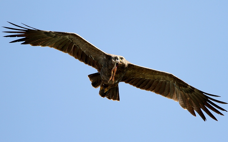 Beskrivelse: This is ad (obviously male) Eagle. It catched a frog from the polder and after eating the inner part it is carrying that to the female which is calling from the nest. I was very lucky with this eagle - after observing the normal route it seemed to fly every time with the capture - using the same route. Finally I went to that route I got a couple of nice shots from the eagle and frog. In Estonian language the name of this eagle is nice: "Väike konnakotkas" means "Small frog eagle".