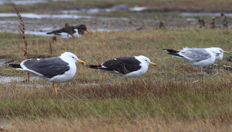 Beskrivelse: Fuglen til venstre er intermedius = Kattegatsildemåge. Et ret stort individ. Hos denne form ses en kontrast mellem helt sorte håndsvingfjer og lidt lysere, svartbagemørk, overside. Fuglen i midten er en fuscus = Østersøsildemåge/Baltisk Sildemåge. Den er generelt mindre og slankere med længere vinger, hvilket kan give et lidt stormmågeaktigt jizz (der ses Stormmåger længst til højre), og oversiden er sort som vingespidsen. Nogle få intermedius har næsten så mørk ryg som fuscus, men jizzet adskiller tit formerne. Ved bestemmelse udenfor Bornholm bør man kombinere kendetegnene, da fuscus efterhånden er ganske sjælden i det meste af landet.