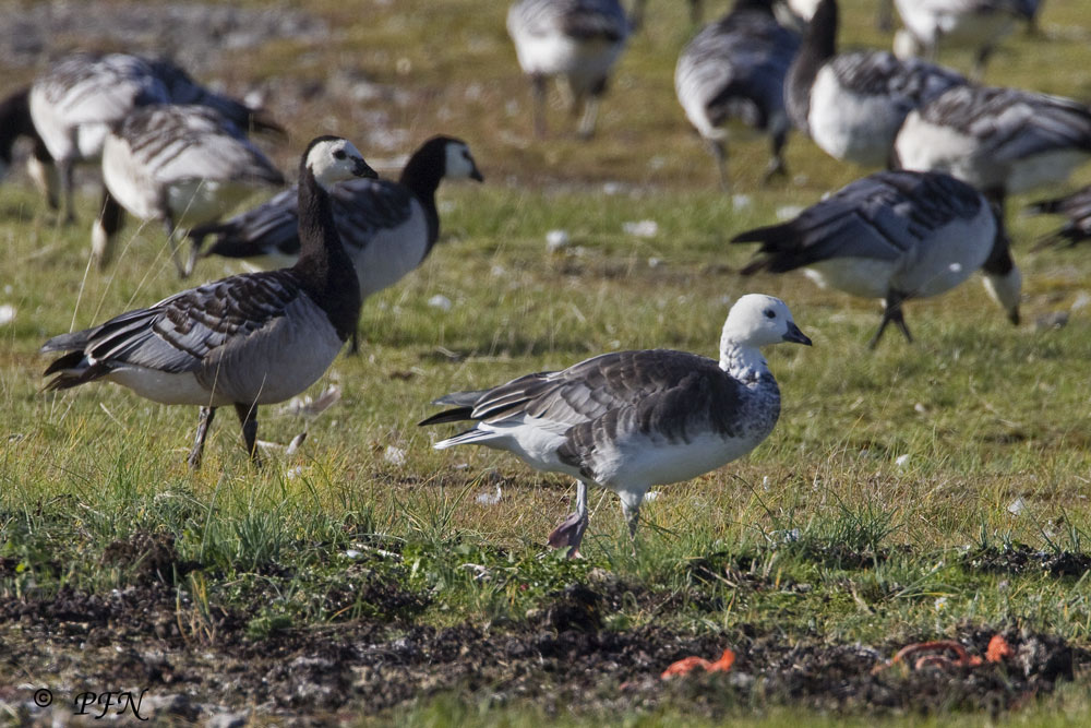 I en blanding af Snegås x Bramgås (caerulescens X leucopsis) ville jeg forvente en gås på størrelse med eller større end bramgås da snegåsen jo er større end bramgås.. Næbbet ligner bramgåsens, også her ville jeg forvente et kraftigere af slagsen mere hen af snegåsens...? Et bud kunne være Ross´s gås (rossii) X Bramgås...! men hybrider er vanskelige og kan falde ud på mange måder.
