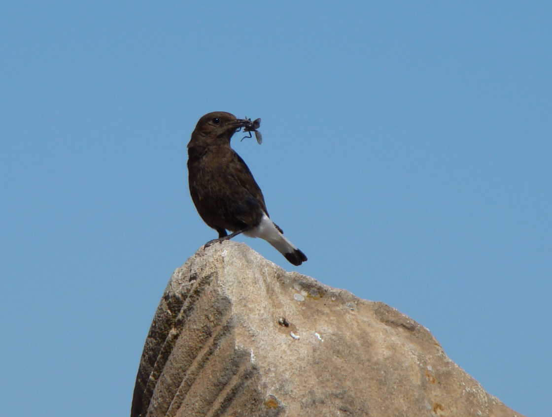 Beskrivelse: When visiting the Roman ruins of Timgad in Algeria I had the chance to see a pair of black wheatears collecting insects. I assume that their nest was not far away...
