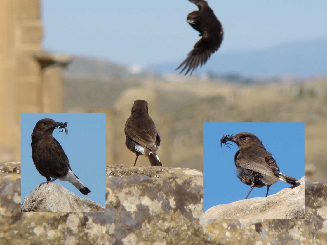 Beskrivelse: When visiting the Roman ruins of Timgad in Algeria I had the chance to see a pair of black wheatears catching insects for their young.