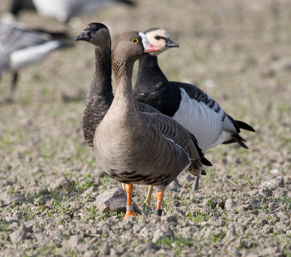 Beskrivelse: A Lesser Whitefronted Goose from the Swedish reintroduction scheme paired with a Barnacle Goose and together with 4 juvenile hybrids (one visible in the background).