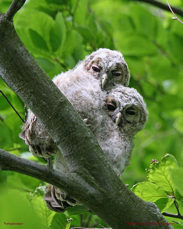 Beskrivelse: Natugleungerne sad det meste af dagen i havens bøgetræer, men var under stort fra Solsorten