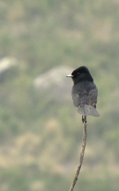 Beskrivelse: Desværre er det ikke muligt at se den diagnostiske hvide basis til hånden, på denne siddende han. Den meget lignende Blue-billed Black Tyrant, uden hvid vingeplet, ses også i samme område.