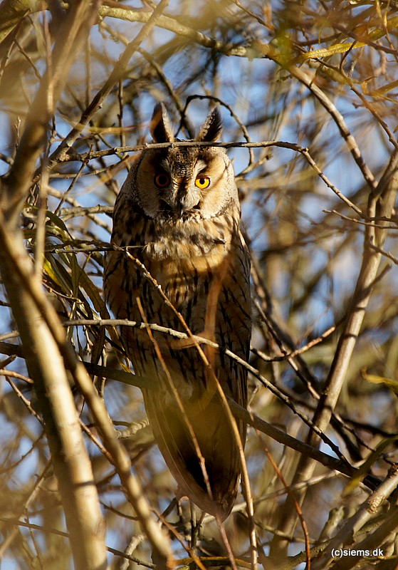 At fuglens venstre øje (set fra os, det højre) fremstår atypisk gult for en Skovhornugle at være, skyldes at øjet er direkte belyst af solen.