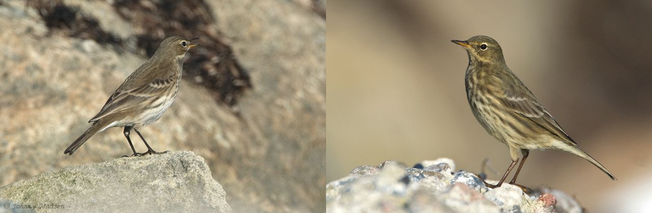 Det er fuglen til venstre, som jeg mener kan være en bjergpiber. Fuglen til højre er en skærpiber.