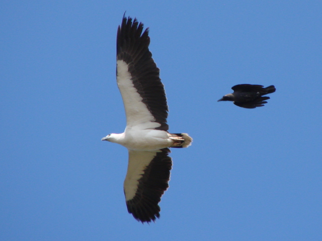 Beskrivelse: The rapidly expanding House Crow (corvvus splendens) population of Gokarna Town beach were giving the Sea eagles no peace, constantly in pursuit.