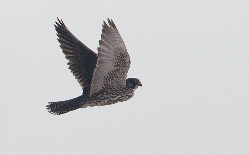 Beskrivelse: På denne for årstiden øde strand sad pludselig en stor falk. Da den lettede fløj den som en anden hønsefugl tung med hævet hoved tydeligvis en mæt fugl efter et større måltid.