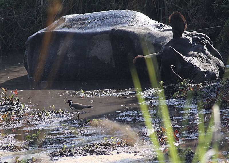 In personal mails, there have been an indication that the animal in question (if not the smaller aves in the foreground) is a goat, but also that the animal could be an Indian One-horned Rhinoceros - hereafter just mentioned "Rhino". This animal only occurs in a few national parks, whereas goats mainly are observed near human habitation. However, there is always a risk, that an escaped goat ("scape-goat") could bewilder itself into a national park; Rhinos are, controversely, sometimes observed in agricultural landscape.