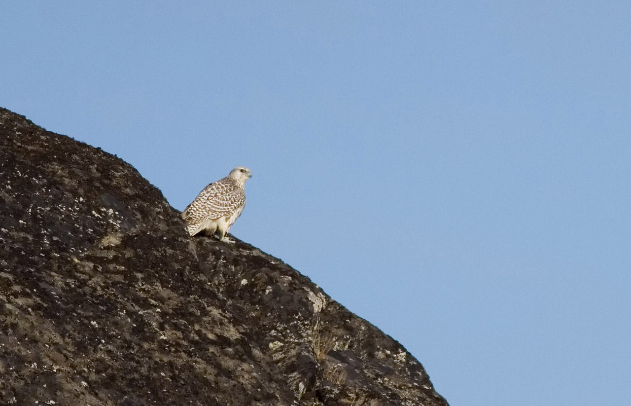 Beskrivelse: Jagtfalk er almindelig omkring Nuuk i trækperioden, men det gør ikke synet mindre smukt!