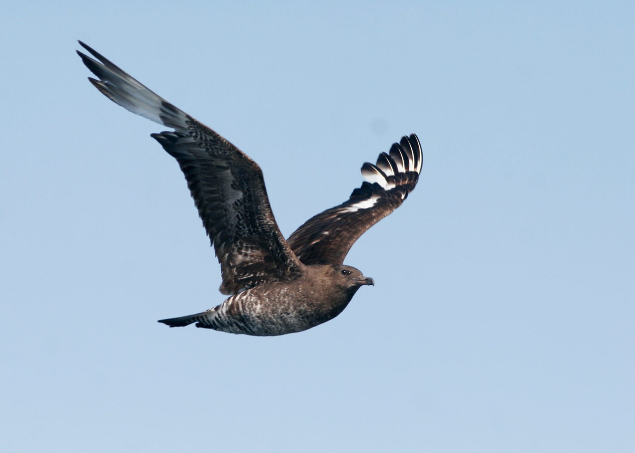 Beskrivelse: From the perspective of a seawatcher from the Northern Hemisphere the skuas all looked strangely pied at a distance, all being dark brown on the upper wings broardly patched with white. A closer look revealed the white patches being the result of moult, unmasking white feather bases.
