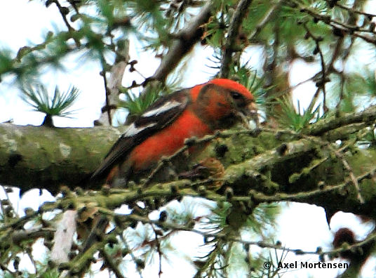 Titel: Vanskelig fugl - svær at se mellem grene og kogler på en regnfuld dag