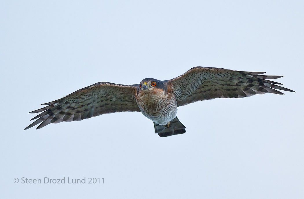 Markus Varesvuo har taget nogle flugtbilleder af en spurvehøg med muligvis endnu mere rødorange øjne. De kan ses på http://www.birdphoto.fi