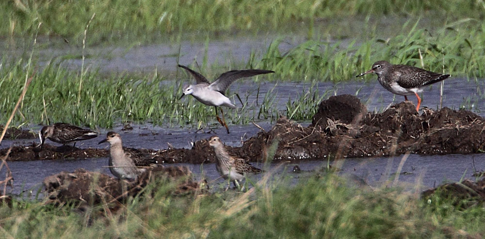 Beskrivelse: Amerikansk Svømmesneppe flyver over Stribet Ryle. På billedet 5 vadefuglearter: De to fra Amerika samt Brushane, Sortklire og Alm. Ryle.