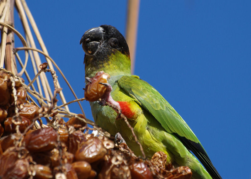 Beskrivelse: En flok på 13 parakitter invaderede dadelpalmerne.