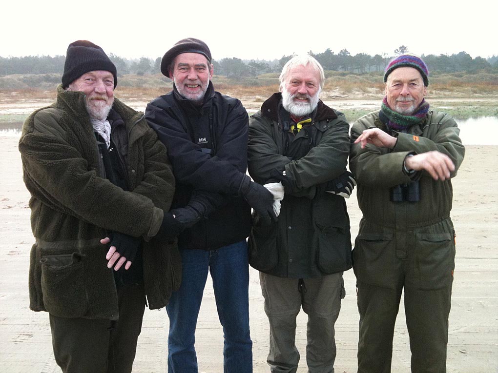 Beskrivelse: Fra venstre Anders Thygesen fra Napstjert få km. syd for Skagen som fik nyt Dk X, han doblede op med endnu en DKer nemlig Bjergpiber på Uggerby strand, Henrik Brandt nyt DK X, Svend Rønnest nyt DK X og Per Poulsen nyt års X de 3 sidstnævnte er fra det meget fuglerige Sydvestjylland, nærmere bestemt Esbjerg.
