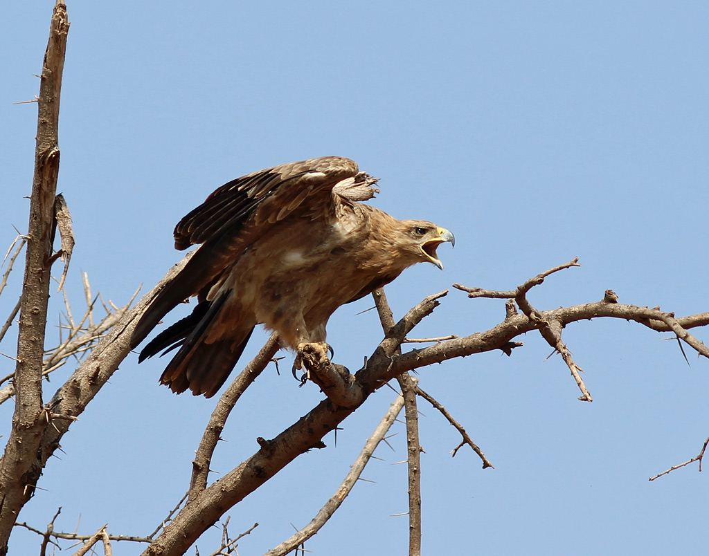 På billedet ser det ud til at den er ved at lette, men den har lige strukket vingerne, og er ved at samle dem igen mens den skriger.