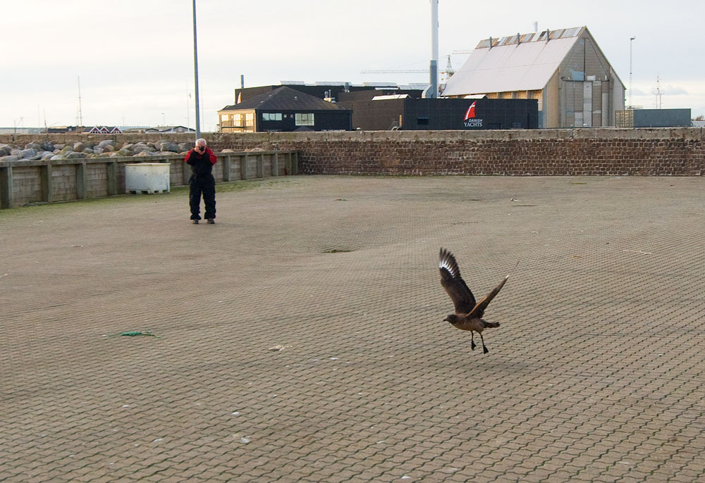 Beskrivelse: Finn Laugo Sørensen fotograferer den meget lidt sky Storkjove, som har holdt til på Skagen Havn i 7 dage indtil videre.