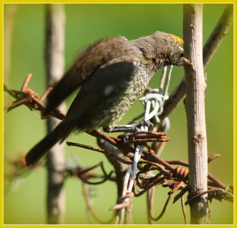 Beskrivelse: Solfugl med gullig hætte på hovedet