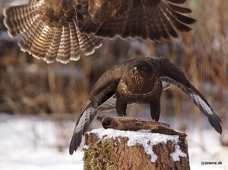 Beskrivelse: Billedet er fra min lille foderplads i baghaven. Den stedlige musvåge var pludselig ikke alene. Først kom denne angriber og senere en mere. Der var drabelige kampe i omegnen - og dagen efter var der kun den hjemmehørende.