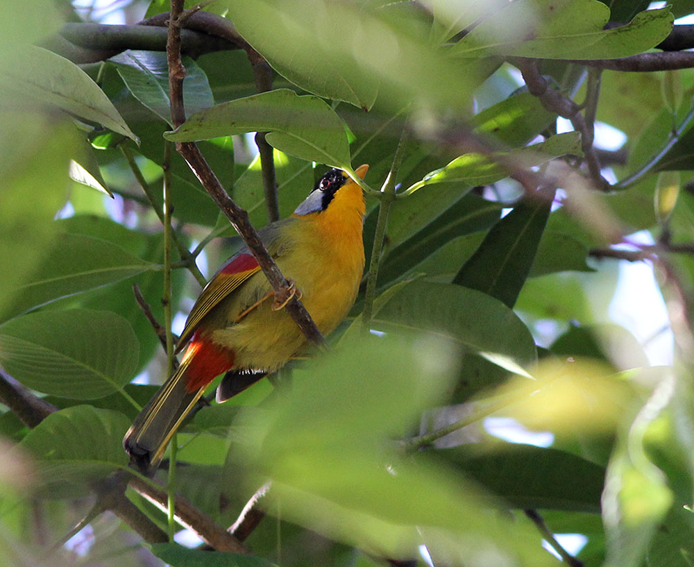 Også fin Red-faced Liocichla (Pragttimalie) + Flagermuspapegøjer / Vernal HANGING Parrot (kun 14 cm),