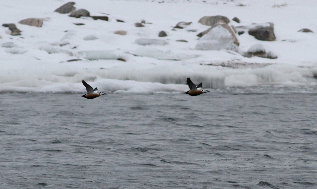 Beskrivelse: These two Steller's Eiders were found on the 5th of February, and are still present. Associating with hundreds of Common Goldeneyes and Common Mergansers on a remote part of the westcoast of The Bothnian Sea.