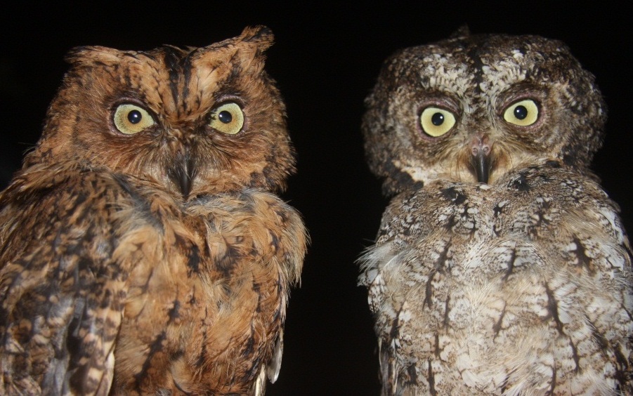 Beskrivelse: Two colour morphs of Otus magicus caught in mistnets during the ZMUC/LIPI 2012 expedition to Seram.