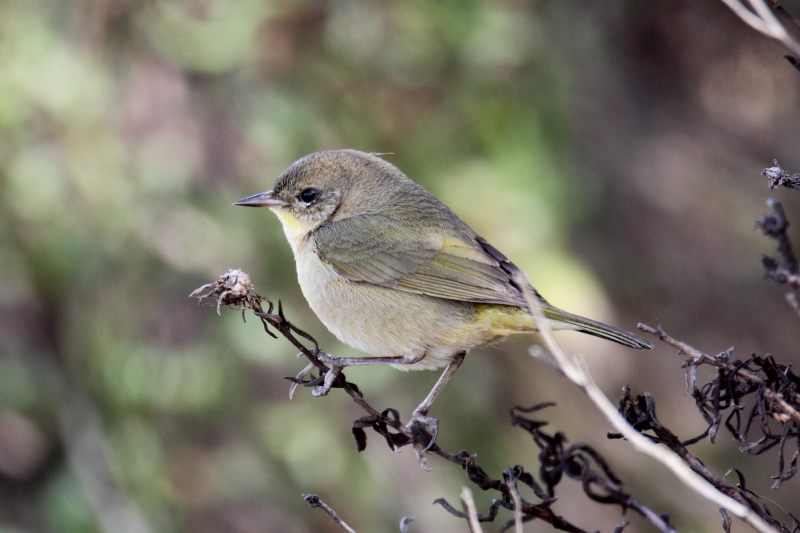 Jeg kan ikke rigtigt få manglen på øjenstribe til at passe på Orange-crowned Warbler. Med gult på strube og undergump (og måske noget sort i ansigtet) synes Common Yellowthroat at være et alternativt bud.