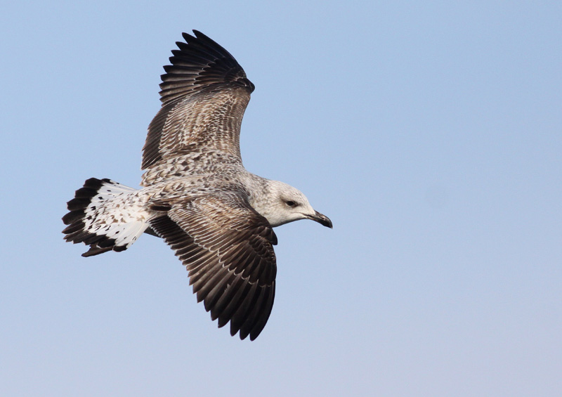 Beskrivelse: Oversiden er det mest typiske på denne Middelhavssølvmåge: ret ensartet mørke vinger og meget skarpt afsat, helt sort endebånd på hvid hale. Undervingedækfjerene er mørke og i kontrast til hvid mave, hvor der dog for arten er "maximal" mørk vatring og bånding på undergumpen. Desuden er lysnende næbrod ret tidlig, da de fleste har sort næb på denne tid af året. Disse uregelmæssigheder kan få hydridspøgelset fremmanet hos nogle.