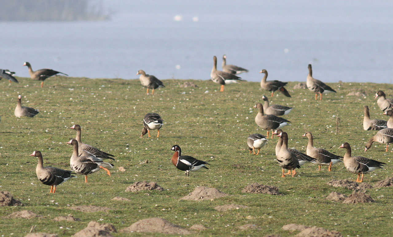 Beskrivelse: For en gangs skyld let at spotte blandt 1200 Blisgæs og 25 Bramgæs. Smuk adult fugl.