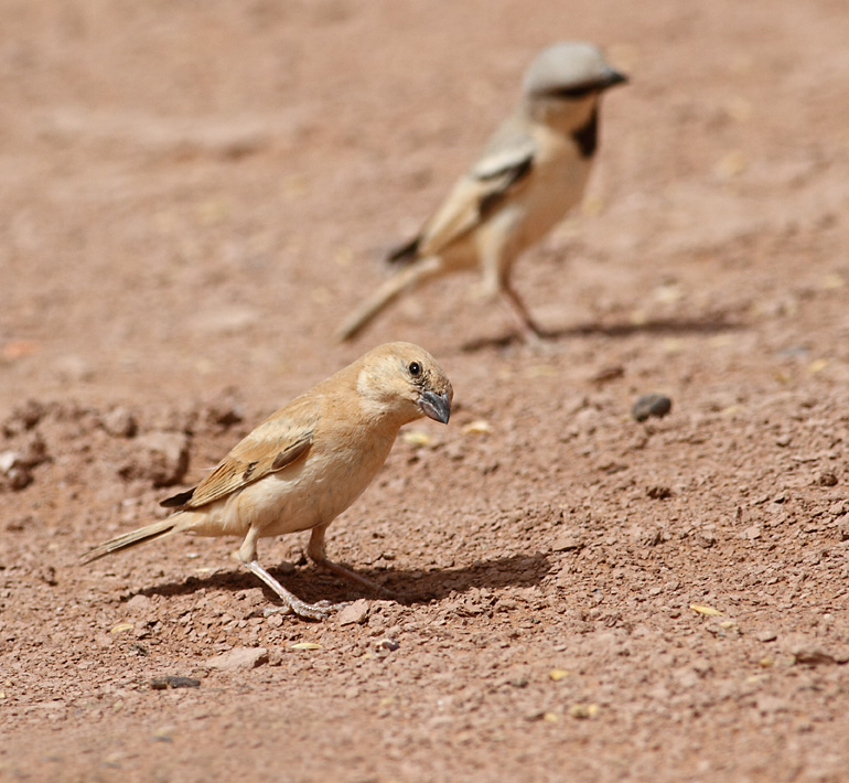 Beskrivelse: Ørkenspurv er en af de fugle jeg rigtig gerne vil se. På en uges Marokko tur boede vi to dage i Zagora tæt på Sahara på et hyggeligt hotel "La Petetite Kasbah" (www.hotelzagora.com) hvis ejer gjorde alt for at vi kunne bo godt. Hjemmefra havde jeg mailet med tur-selskabet: www.caravanedesertetmontagne.com og dens ejer Brahim Mohamed Elaabdouli for at arrangere en 1-dags tur til Ørkenen vest for M'hamid, som er den sydligste by før Sahara (og tæt på Algeriet). Det var en god ide - de havde forståelse for mine "fugle-krav" og jeg har mistænkt dem lidt for at lægge foder ud til ørkenspurvene inden vi kom til et raste sted midt i sandet (han og hun set). Det lykkedes mig dog inden at finde et par i nogle af de få træer der er i Sahara. I øvrigt kom flokke af nysgerrige ørkenravne tæt på vores raste sted.