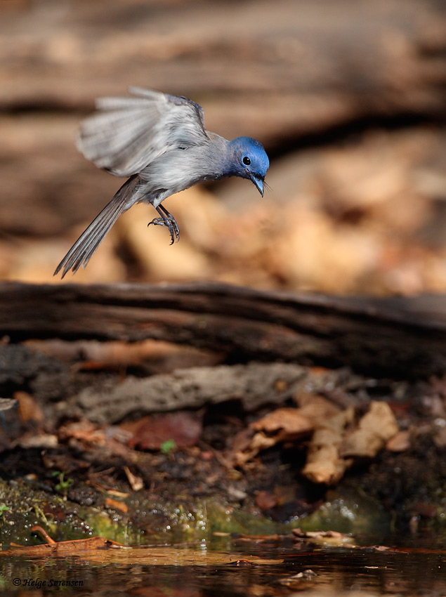 Beskrivelse: I modsætning til de fleste andre fugle bader monarken ikke ved at sidde i vandhullet. Istedet flyver den på isfugle-maner ned i vandet i et plask og hurtigt op igen på en gren hvor den så sidder og pudser sig.